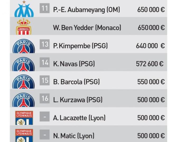 法国权威媒体《队报》公布了最新法甲球员薪水调查报告。巴黎的薪资水平在法甲毫无疑问是独一档的存在,排名前十的球员全被巴黎包揽。梅西和内马尔去夏离队后,姆巴佩成为法甲的“打工皇帝”,月薪600万欧元(税前),第10的穆凯莱为70万,并列第11的是马赛的奥巴梅扬和摩纳哥的本·耶德尔,为65万。