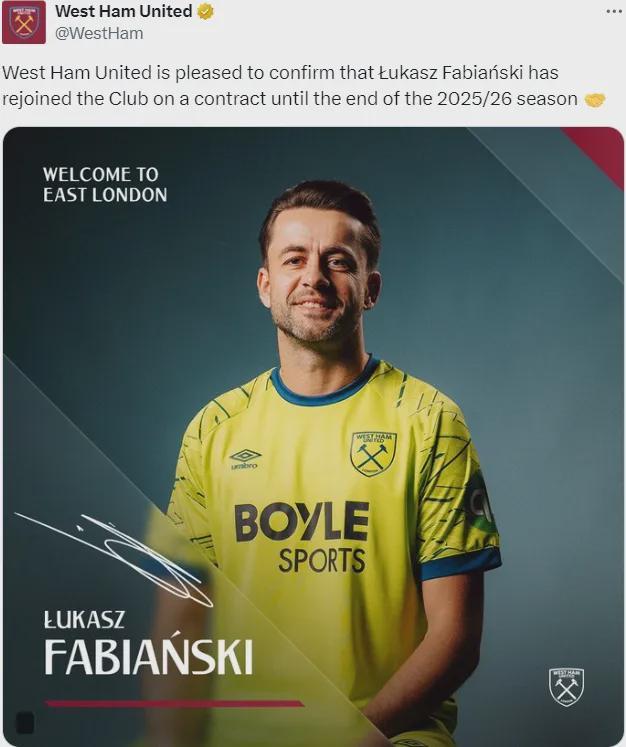 官方:西汉姆宣布签回了法比安斯基,双方签下了一份本赛季结束后到期的合同。